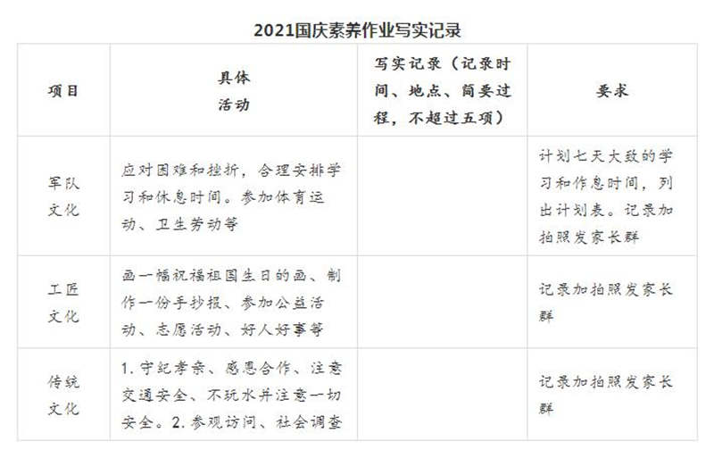 國慶小長假又到了,為了讓孩子們過一個充實有意義的假期,我們誠邀各位家長朋友與學(xué)校攜手共同抓好孩子的養(yǎng)成教育,按《2021國慶素養(yǎng)作業(yè)寫實記錄》要求督促小孩完成。