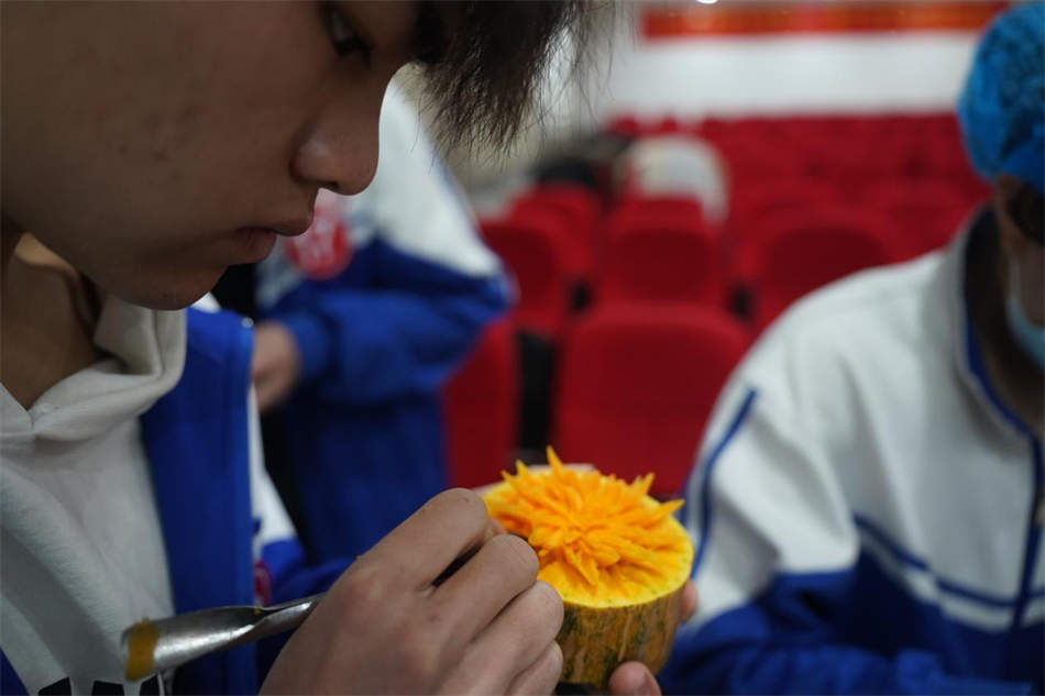 廚藝刀工食品雕刻比賽同樣精彩紛呈。賽場(chǎng)上,學(xué)生們展示了優(yōu)秀的刀工技藝和食品雕刻能力。比賽分為刀功技法和食品雕刻兩個(gè)環(huán)節(jié),要求參賽者在規(guī)定的時(shí)間內(nèi)完成土豆絲的切割和月季花、石拱橋等食品雕刻。學(xué)生們?nèi)褙炞?,刀法嫻熟,雕刻出的作品栩栩如生,令人贊嘆。