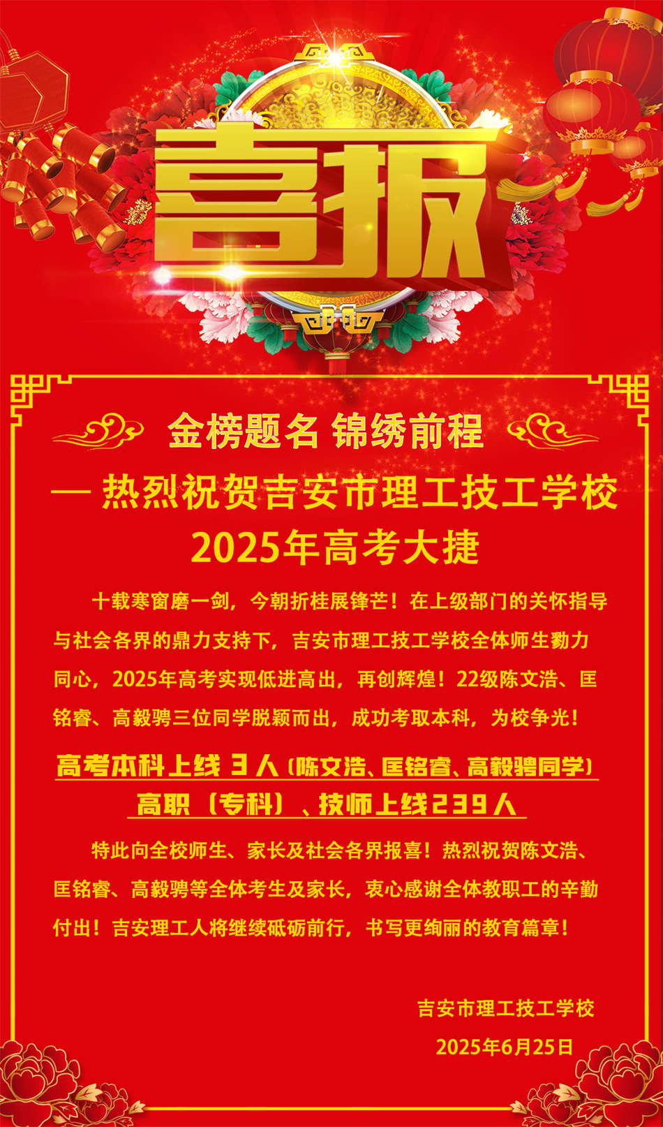 【喜報(bào)】熱烈祝賀吉安市理工技工學(xué)校2025年高考大捷!