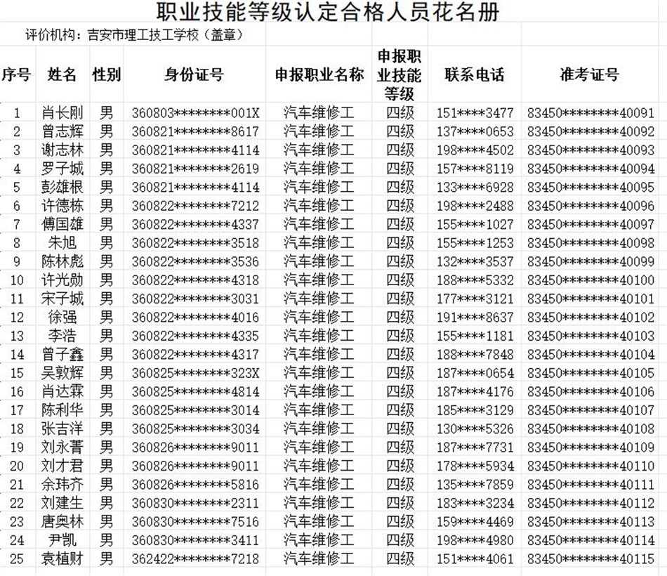 按照《贛人社規(guī)〔2022〕7號》文件精神。我校于2025年10月24日-25日開展了汽車維修工(汽車維修檢驗(yàn)工)等級認(rèn)定,共25人(四級),通過認(rèn)定考核25人。現(xiàn)對認(rèn)定考核合格人員進(jìn)行公示。(名單附后)