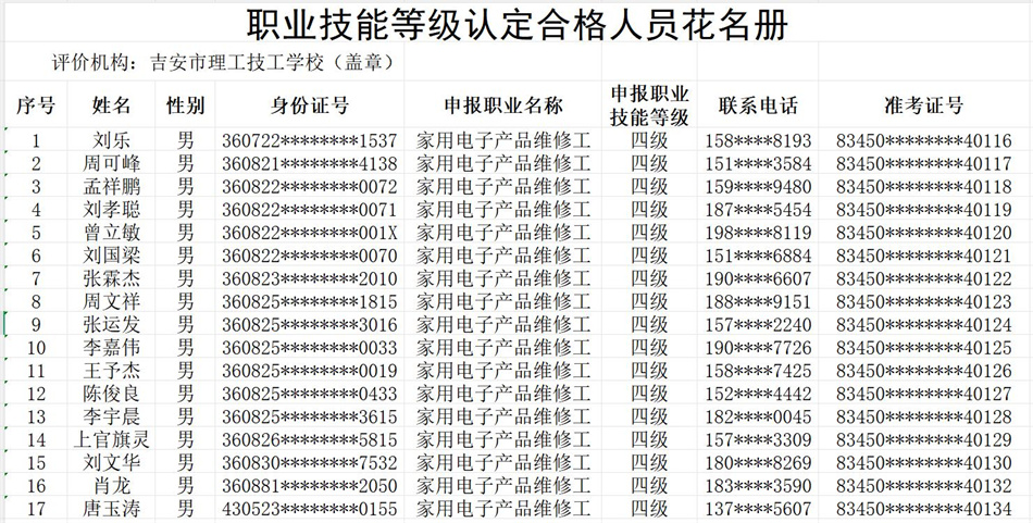 按照《贛人社規(guī)〔2022〕7號》文件精神。我校于2025年10月24日開展了家用電子產(chǎn)品維修工等級認定,共20人(四級),通過認定考核17人?,F(xiàn)對認定考核合格人員進行公示。(名單附后)