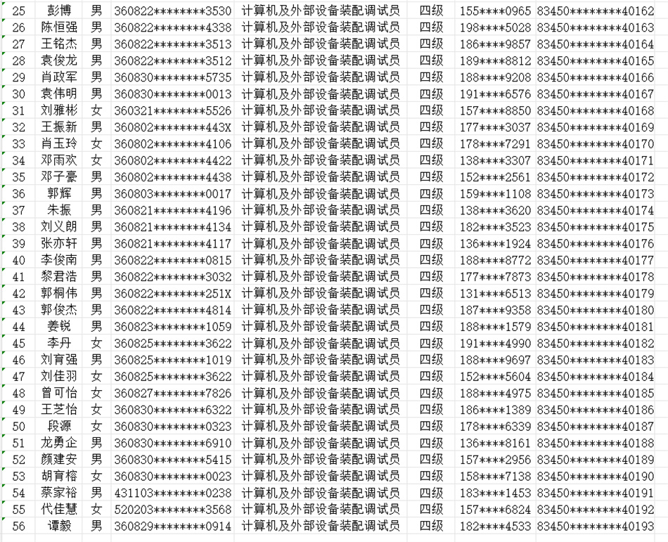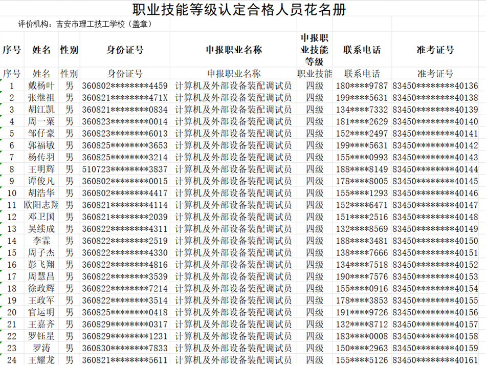 按照《贛人社規(guī)〔2022〕7號》文件精神。我校于2025年10月24日開展了計算機及外部設(shè)備裝配調(diào)試員(計算機整機裝配調(diào)試員)等級認定,共58人(四級),通過認定考核56人?,F(xiàn)對認定考核合格人員進行公示。(名單附后)