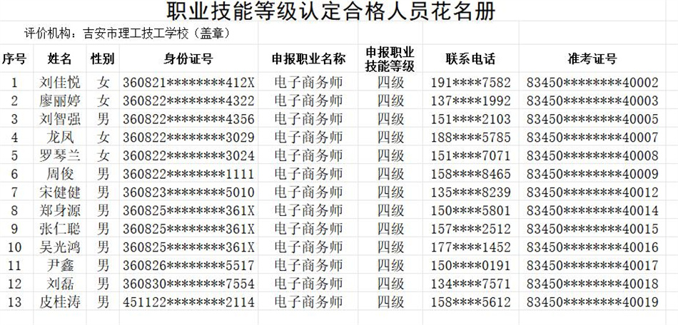 按照《贛人社規(guī)〔2022〕7號(hào)》文件精神。我校于2025年10月24日開(kāi)展了電子商務(wù)(網(wǎng)商)等級(jí)認(rèn)定,共19人(四級(jí)),通過(guò)認(rèn)定考核13人?,F(xiàn)對(duì)認(rèn)定考核合格人員進(jìn)行公示。(名單附后)
