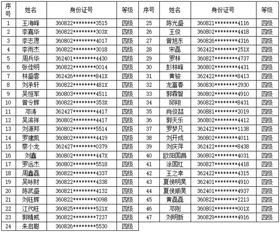 根據(jù)《江西省人力資源和社會保障廳關于遴選備案職業(yè)技能等級認定社會培訓評價組織的通知》(贛人社字(2020)302號)、《江西省人力資源和社會保障廳關于公布江西省第二批職業(yè)技能等級認定社會培訓評價組織的通知》(贛人社字(2022)128號)文件要求。按照《關于開展“互聯(lián)網(wǎng)+職業(yè)技能等級認定”試點工作的通知》(贛人社字〔2020〕397號)精神。我校于2024年4月15日開展了汽車維修工(汽車維修檢驗工)等級認定,共48人(四級),通過認定考核47人?,F(xiàn)對認定考核合格人員進行公示(名單附后)。