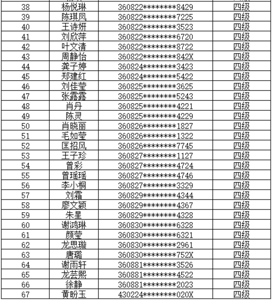 根據(jù)《江西省人力資源和社會保障廳關(guān)于遴選備案職業(yè)技能等級認定社會培訓評價組織的通知》(贛人社字(2020)302號)、《江西省人力資源和社會保障廳關(guān)于公布江西省第二批職業(yè)技能等級認定社會培訓評價組織的通知》(贛人社字(2022)128號)文件要求。按照《關(guān)于開展“互聯(lián)網(wǎng)+職業(yè)技能等級認定”試點工作的通知》(贛人社字(2020)397號)精神。我校于2024年10月31日開展了養(yǎng)老護理員等級認定,共70人(四級),通過認定考核67人?,F(xiàn)對認定考核合格人員進行公示(名單附后)。